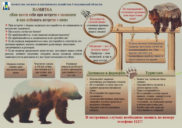 С памятками правил поведения при встрече с медведем можно ознакомиться на официально сайте администрации Южно-Сахалинска.