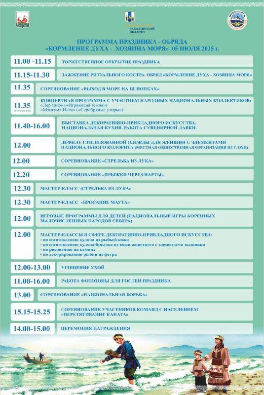 Традиционный межмуниципальный праздник-обряд «Кормление духа — хозяина моря» состоится 5 июля в Поронайске в 11:00. Представители коренных малочисленных народов Севера в 33-й раз соберутся на берегу залива Терпения, чтобы задобрить Духа моря. Согласно поверьям, ритуал не только благоволит рыбакам во время летней путины, но и защищает от природных бедствий.
