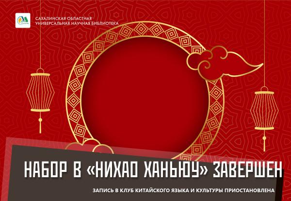Сахалинская областная универсальная научная библиотека прекратила запись новых участников в клуб китайского языка и культуры «Нихао Ханьюу». Администрация учреждения полностью сформировала учебную группу на текущий период.