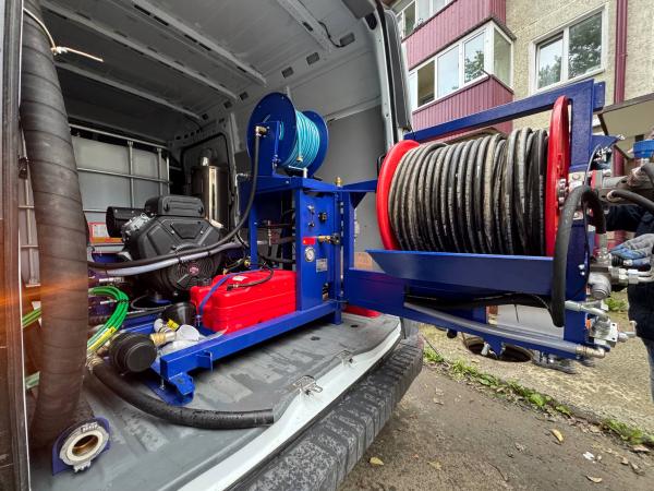 Техника оснащена мощным двухканальным насосом, который создает давление до 16 атмосфер. Это позволяет машине проводить бесперебойную промывку труб разного диаметра и эффективно удалять иловые отложения.