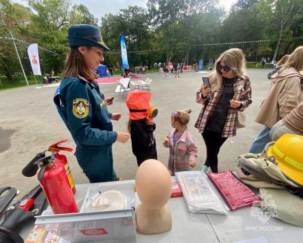Сотрудники госпожнадзора Южно-Сахалинска, отдела кадров и пожарные рассказывали участникам о профессиях в МЧС России, напоминали о мерах предосторожности, вручали информационные буклеты. Каждый смог примерить боевую одежду пожарного — малыши в полной экипировке становились настоящими героями.