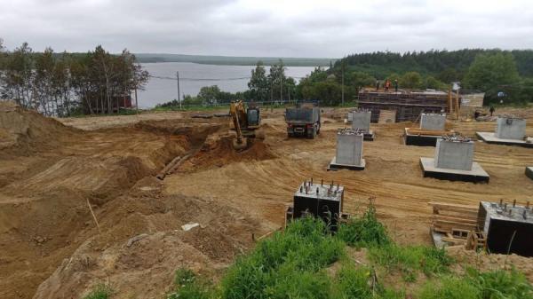 Ежедневно на строительной площадке работают около десяти специалистов и три единицы техники. Работы идут по графику: строители уже смонтировали фундаментную плиту контактного резервуара, выполнили армирование стен и перенесли инженерные сети. Сейчас рабочие монтируют перекрытия и готовятся возводить стены резервуара, одновременно разрабатывая котлован под основные здания и устраивая фундаменты.