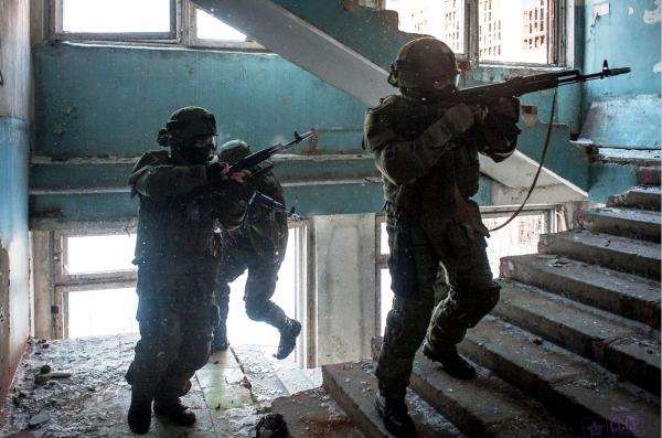 Отдельным курсом военнослужащие проработали прикрытие друг друга, передвижение по лестничным маршам и зачистку помещений в составе боевых двоек и троек.