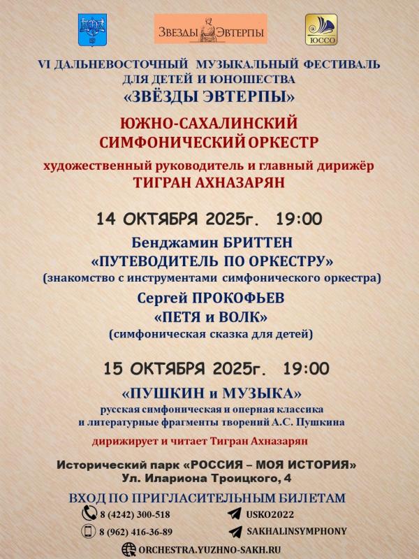 Южно-Сахалинский симфонический оркестр приглашает жителей и гостей города на два уникальных концертных вечера. Мероприятия состоятся 14 и 15 октября в Историческом парке «Россия – моя история» и пройдут в рамках VI Дальневосточного музыкального фестиваля для детей и юношества «Звезды Эвтерпы».