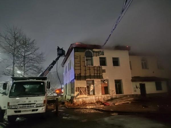 Сообщение о пожаре по адресу: г. Поронайск, Восточная, 47А, поступило в диспетчерскую службу Поронайского пожарно-спасательного отряда 6 ноября в 22:02. Через 2 минуты работники пожарно-спасательной службы прибыли на место происшествия. К этому времени на площади 300 кв. м открытым пламенем горело неэксплуатируемое здание бывшей полиции, перекрытия второго этажа были частично обрушены.
