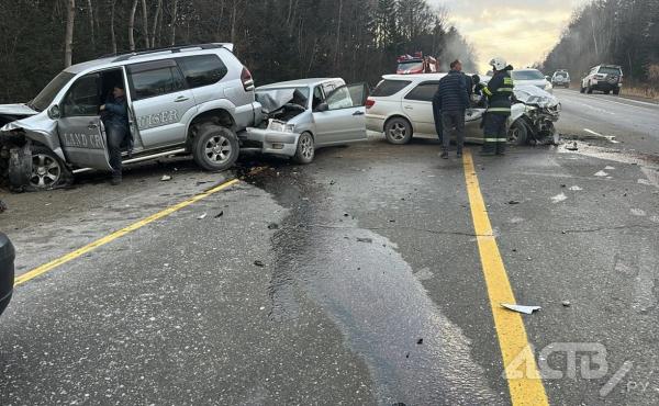 Три автомобиля жестко столкнулись на корсаковской трассе