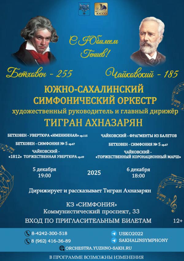 Цикл концертов под названием «С Юбилеем, Гении!» подготовил Южно-Сахалинский Симфонический оркестр под руководством дирижера и художественного руководителя Тиграна Ахназаряна. Как рассказали ТИА «Острова» в оркестре, два юбилейных концерта запланированы на 5 и 6 декабря в зале «Симфония». В 2025 году мировое музыкальное сообщество отмечает эти знаковые даты, и сахалинские музыканты присоединяются к празднованию.