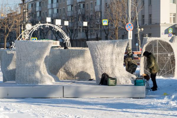 На площади Ленина в Южно-Сахалинске устанавливают световые фигуры белых медведей